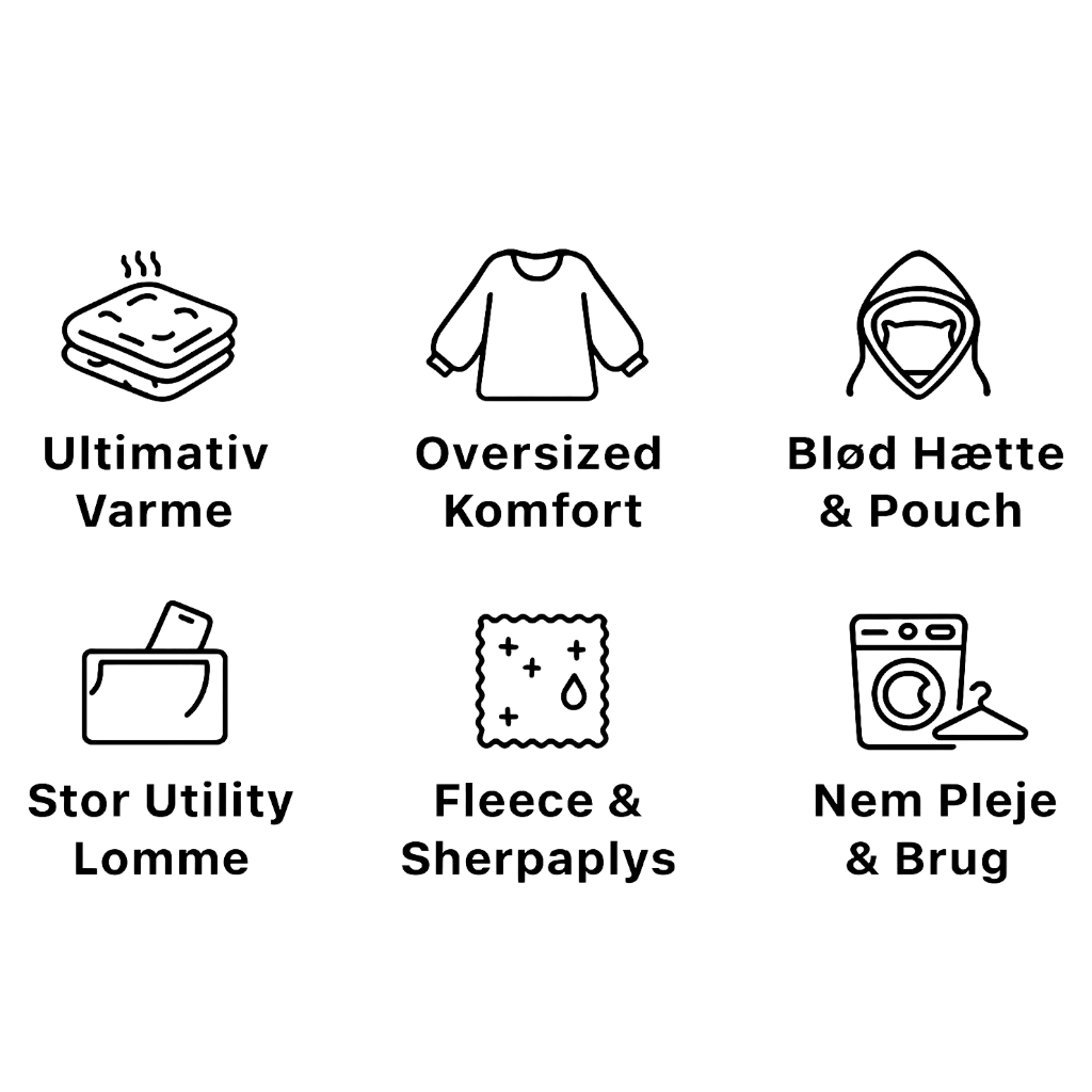 - Det ultrabløde flannel fleece-yderstof og det lune sherpa-fór gør hoodie’en uundværlig, når du først har prøvet den. Den er rummelig, varm og designet til at give dig følelsen af et kram – hver gang du tager den på.